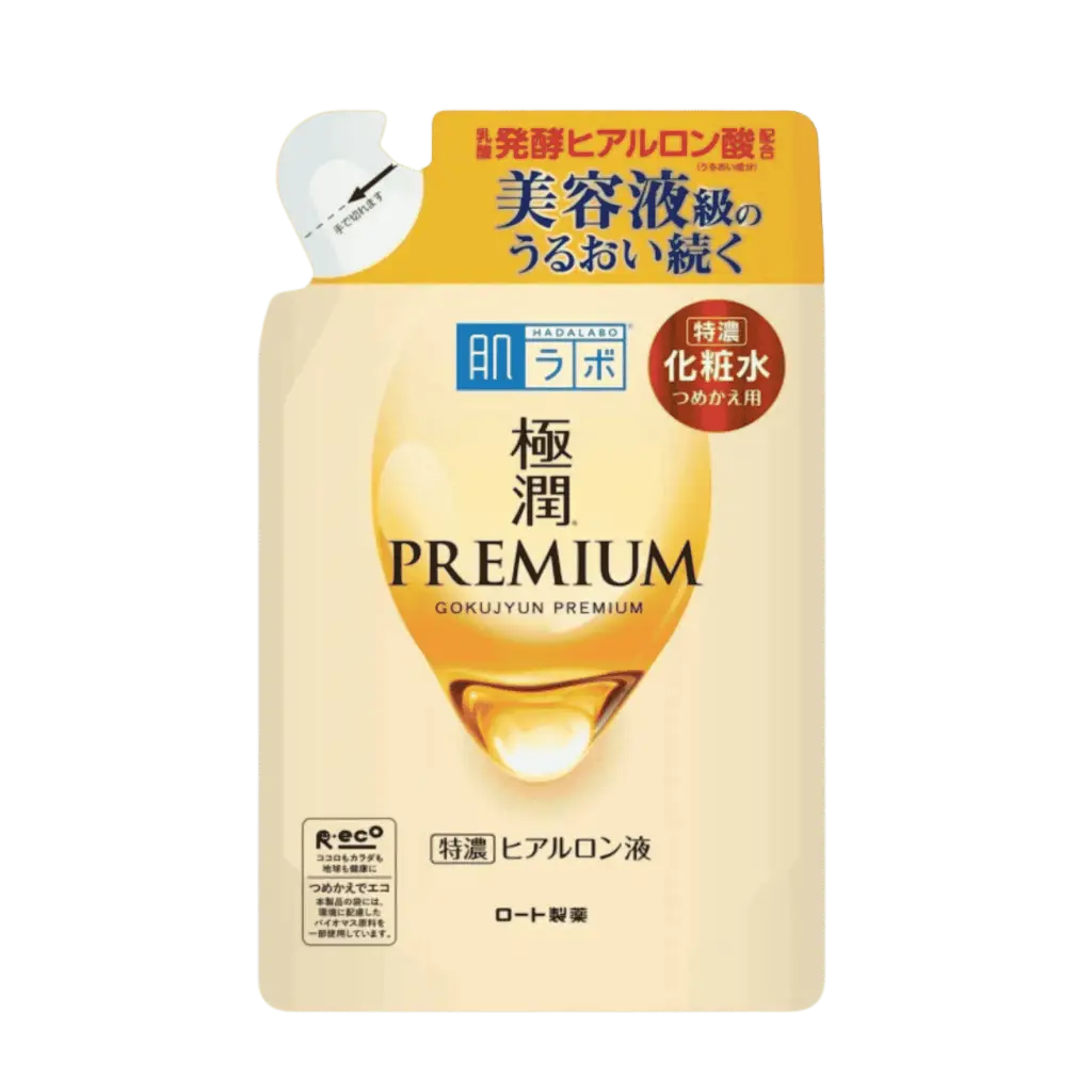 Rohto Hada Labo Gokujyun Premium Lotion deeply hydrates with 7 types of hyaluronic acid, free from irritants like fragrance and alcohol.